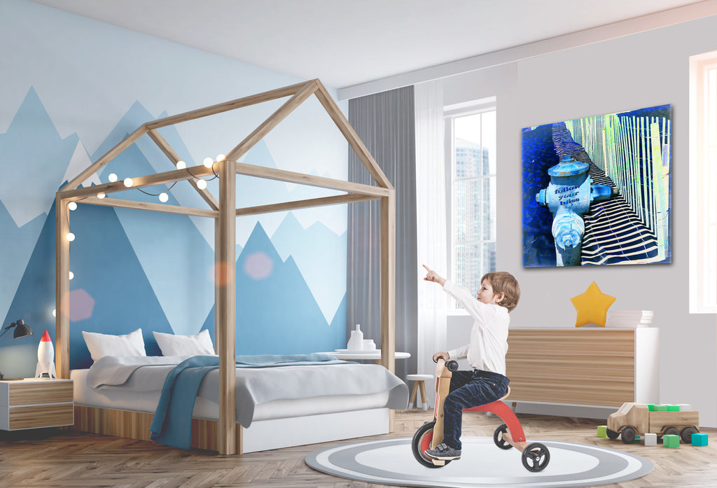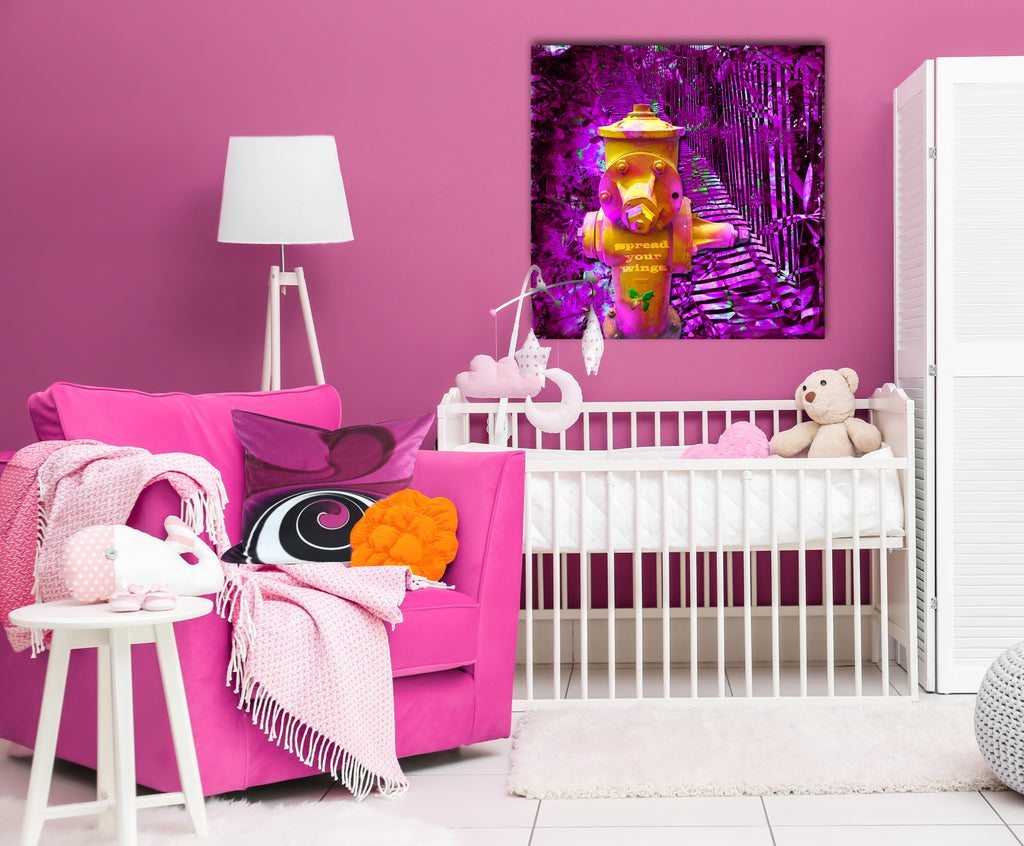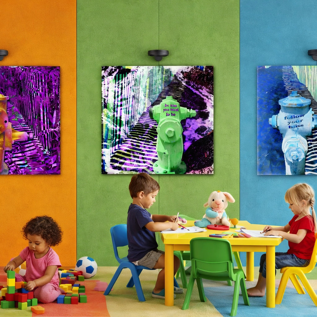 The three central canvases take everyday objects, fire hydrants, and transform them into vibrant, surreal icons that carry hidden "Easter egg" messages of encouragement. The playroom feels energetic but safe, expressive but grounded, a place where kids can create freely while being surrounded by visual messages that say: you’re capable, you’re welcome, and you’re exactly who you’re meant to be.