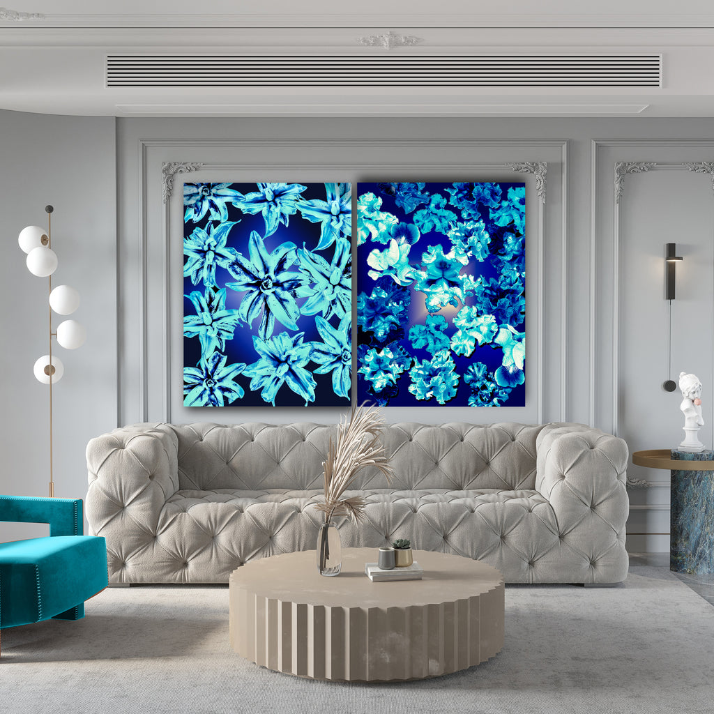 Macro photos of Irises, all colorized in a shade of blue. Named after the Greek goddess of the rainbow, Irises bring color to the garden in spring and summer. These versions have been digitally manipulated, multiplied and colorized, providing a luminous glass-like look.