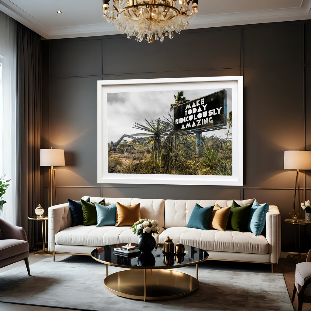 This piece is a digital composite set in the rugged, windswept landscape of Torrey Pines State Natural Preserve in Del Mar, California. By dropping a bold, weathered billboard into the park’s famous prehistoric cliffs and rare trees, the work creates a moment of unexpected encouragement in the middle of a hike. The message is loud and intentionally over-the-top, offering a bit of playful defiance against the quiet, serious beauty of the coast. It’s a reminder that even when the trail is steep, you can still choose to make the day something special.