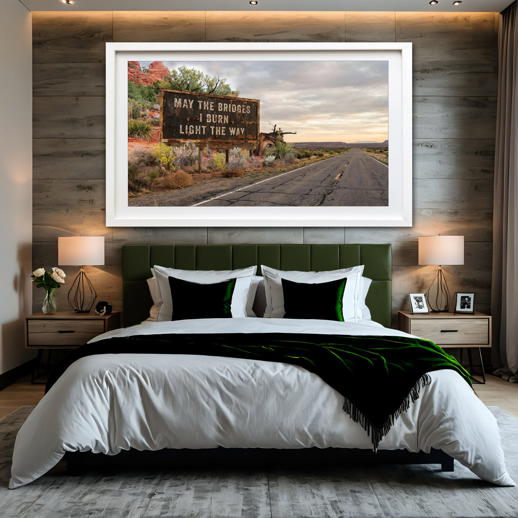 Sometimes the only way to move forward is to make sure you can’t go back. This piece is a nod to the beauty of a fresh start, even the messy ones. Set on a long, cracked highway leading into the red rock horizon, the sign suggests that your past mistakes (or deliberate "burns") aren't just baggage; they’re the flares that show you where to go next. It’s for anyone who’s ever traded a "sure thing" for a wide-open road. Locale is Sedona, Arizona.