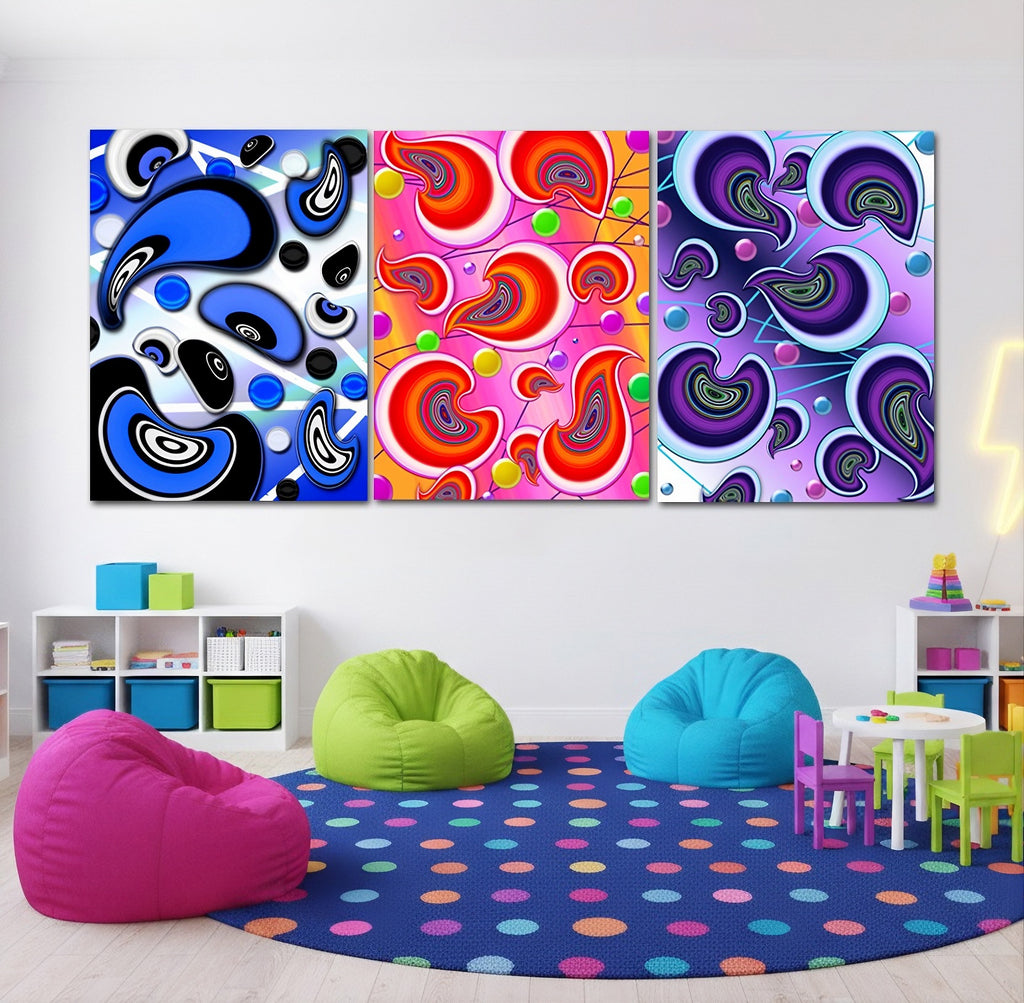 As a playroom concept, rooted in a rich color aesthetic, these 30 x 40 panels, printed on metal, create a high-energy environment that balances bold geometric patterns with soft, playful elements.