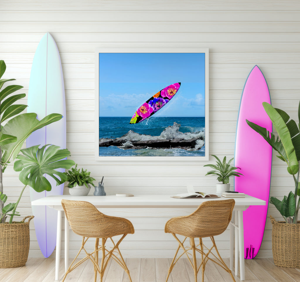 The surfboards are decked out with my floral photomontages, adding a fun Hawaiian vibe.
